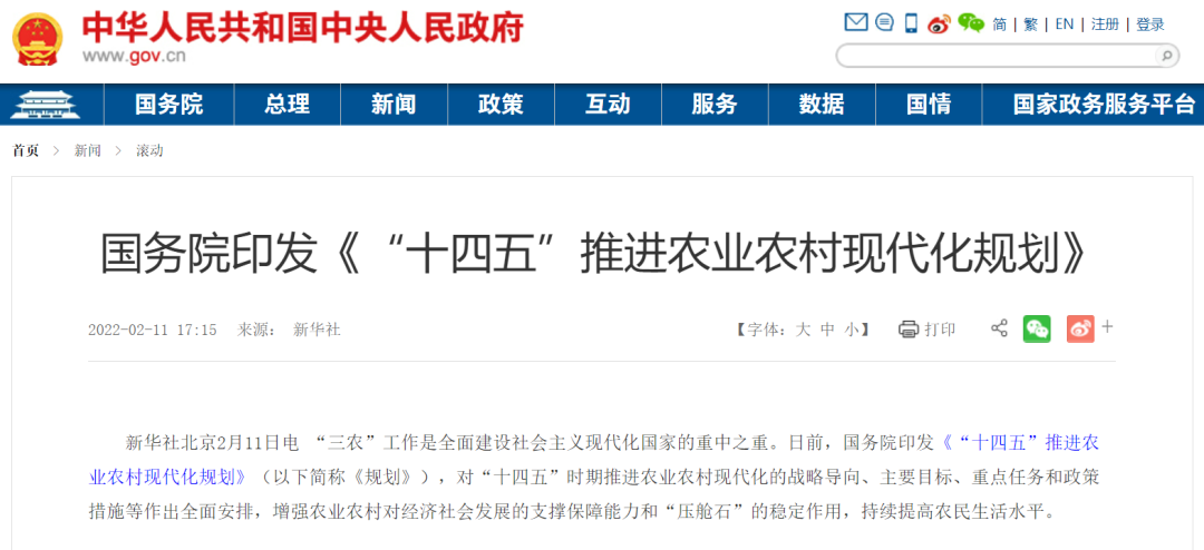 日前,国务院印发《“十四五”推进农业农村现代化规划》(以下简称《规划》),对“十四五”时期推进农业农村现代化的战略导向、主要目标、重点任务和政策措施等作出全面安排,提出要增强农业农村对经济社会发展的支撑保障能力和“压舱石”的稳定作用,持续提高农民生活水平。