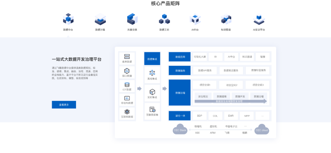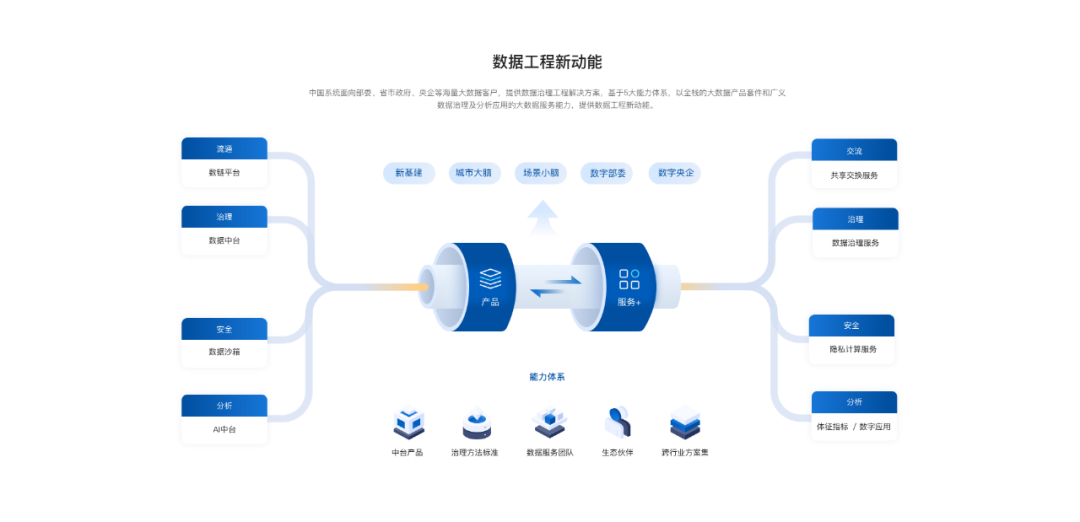 一中台跨多云实现算力资源融合,一中台适配与接管不同大数据引擎的数据资源,从而实现计算与算料资源融合,一中台支持多个数据组织在线协同实现治理能力融合。
