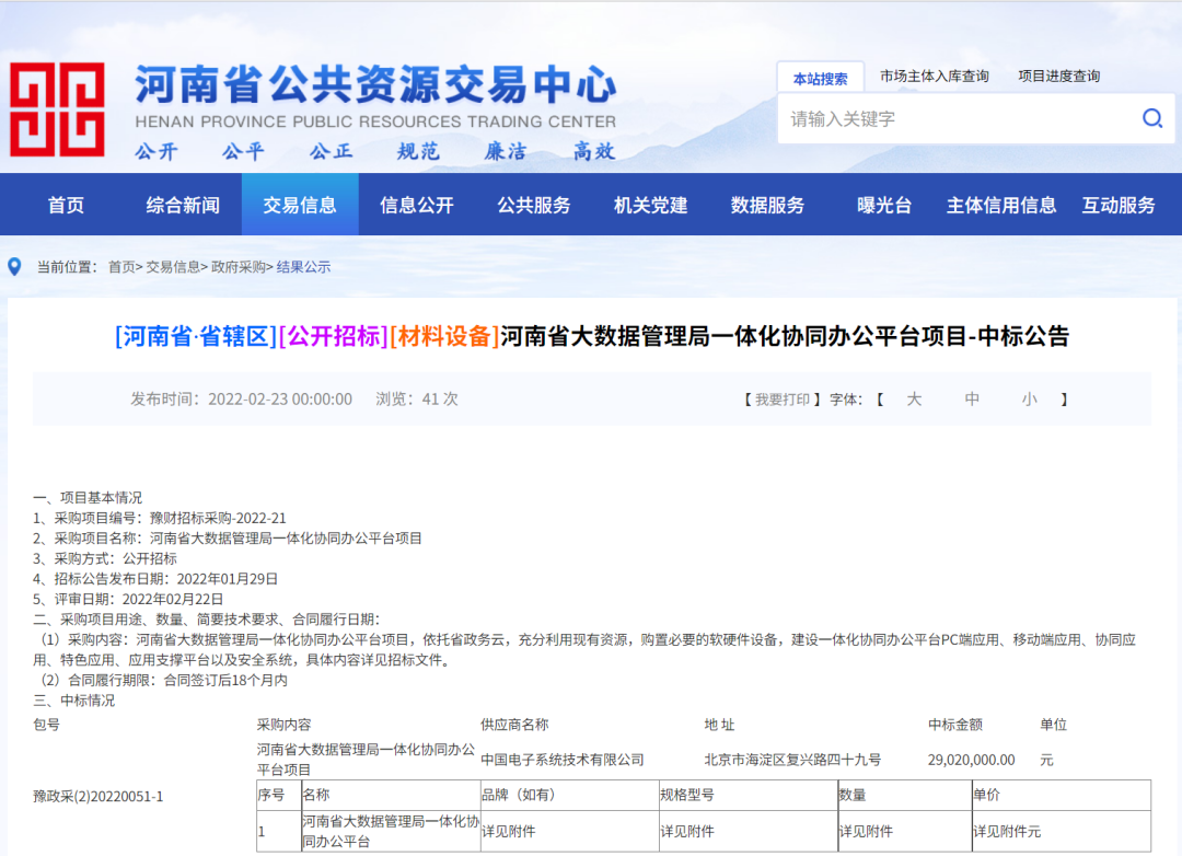 近日,河南省大数据管理局一体化系统办公平台项目中标公告正式发布,永乐高系统成功中标。