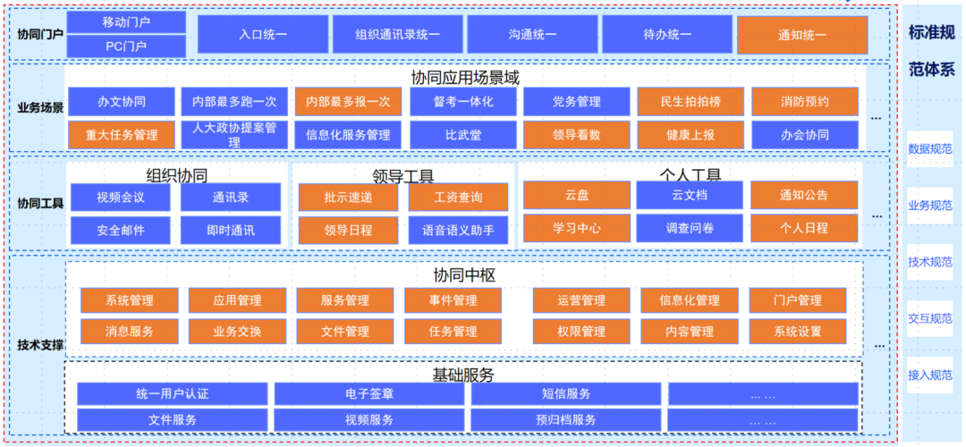 3、协同应用围绕跨部门跨层级“组织协同、办文协同、办会协同、办事协同”等日常办公事务,形成统一门户,打造应用统一入口,满足服务统一呈现,实现“业务全覆盖、应用全集成、数据高可用”,满足政府组织灵活、协同办文、沟通办会、统合办事的需求,帮助政府实现安全、便捷、高效的一体化协同办公。