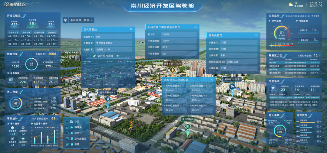 在南通市崇川经济开发区,针对60岁以上“空巢”老人和失独老人,通过佩戴可穿戴智能手表,可以将心率、血压、血糖等身体参数上传到云端,在社区微脑平台形成一份份电子档案,让亲人、医生、专家和社会治理人员都能及时进行有效的监护;在低碳发展方面,环保监测部门可以实时掌握整个开发区内空气质量状况,及时发现异常情况。