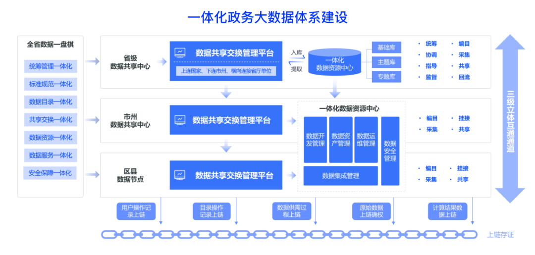 一体化政务大数据平台包括政务大数据中心省级节点、地市节点及区县节点(按需),通过统建模式或级联对接方式实现节点间的互联互通。上接国家,下联地市,横向到边,纵向到底,以目录为数据管理基础,实现以用促建、共治共享的全省数据一盘棋,是各级数字政府建设的基石。