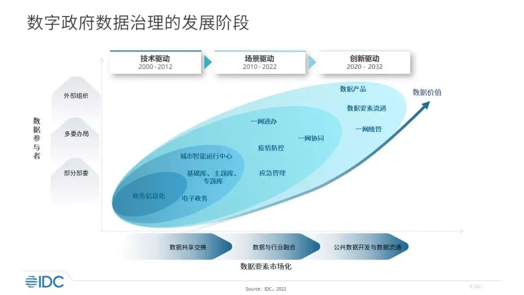 IDC指出,中国政务数据治理经历了由技术驱动,到场景驱动,再到创新驱动的三个发展阶段。从2021年开始的“十四五”规划将加快推进数据要素市场化建设,围绕“数字产业化、产业数字化”,促进行业间的数据开放和流通,创新的、效益化的数据应用能够正向激励数据要素的使用,政务数据治理将进入创新驱动阶段。