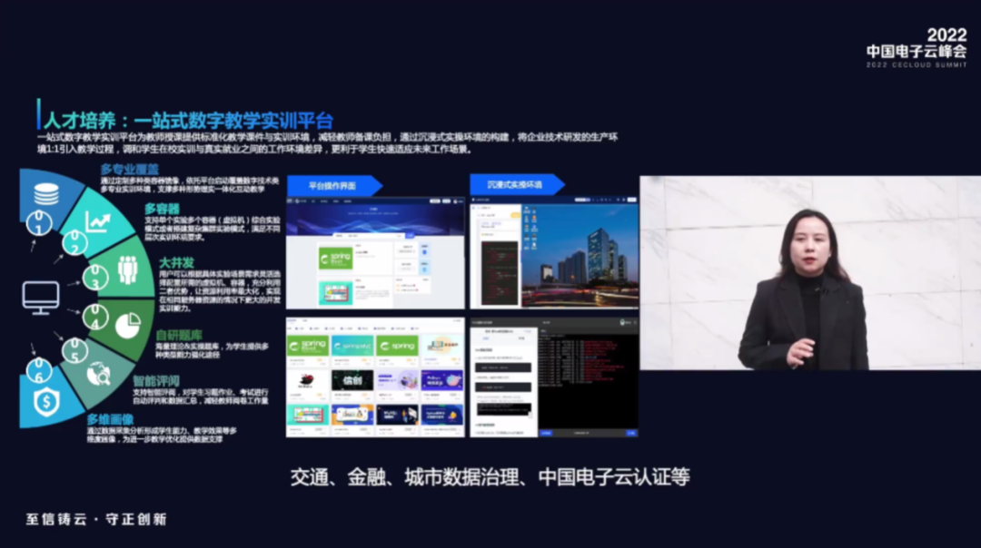 永乐高电子云任冬梅带来数字产教融合解决方案的相关分享。她介绍道,我们基于自身在网信领域的产业优势,提出以数字化+信创化,构建信创智慧校园底座,打造数字产教融合新基建,助力产教融合与教育信创,服务人才培养和校园治理。信创智慧校园底座的“数字化”是以云为基、数为核,实现学校数字化转型和效能提升,而“信创化”则是提前布局,逐步建设,实现关键基础设施的自主可控。基于信创智慧校园底座在学校分别展开三大应用场景:以数字经济产业学院提升学生数字实践技能;以数字联合科研平台与教师企业实践为教师数字多维能力进行赋能;以信创智慧校园基地整体为校园数字治理效能进行提升。