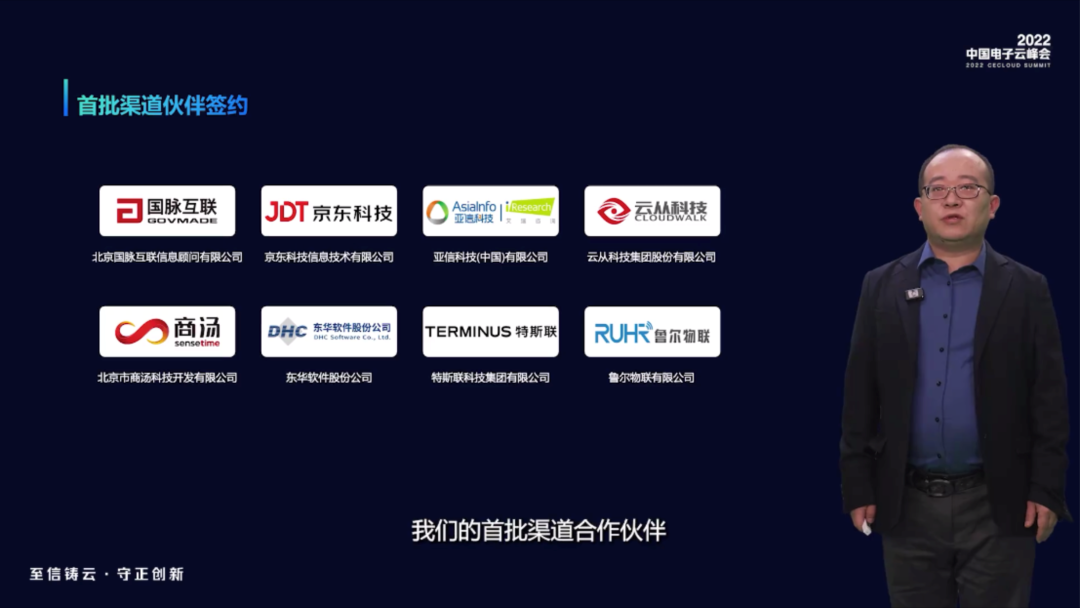 一直以来,永乐高电子云积极落实发展现代数字城市业务的战略部署,联合内外部生态伙伴,构建持续发展、合作共赢的现代数字城市生态圈。在最后,永乐高电子云刘戈公布了首批渠道合作伙伴,分别是北京国脉互联信息顾问有限公司、京东科技信息技术有限公司、亚信科技(中国)有限公司、云从科技集团股份有限公司、北京市商汤科技开发有限公司、东华软件股份公司、特斯联科技集团有限公司以及鲁尔物联有限公司。